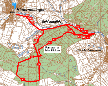 N2 (7,2 km) und N3 (9,8 km) beginnen am Abzweig rechts vor der ehemaligen Ladestation der Kerkerbachbahn. Die Strecken führen durch den Wald und bieten nach ca. 600 m einen beeindruckenden Blick auf die Tongrube Maria. Anschließend biegt man links ab und erreicht nach weiteren 400 m eine Kreuzung. Hier hat man die Wahl, entweder eine Zusatzstrecke von ca. 2,5 km zu nehmen (gekennzeichnet mit N3: rechts abbiegen bei der Kreuzung, dann links in Richtung Waldrand mit schönem Blick auf Obertiefenbach, über den "Heckweg" zur Kreuzung zurück) oder direkt links und nach 100 m nochmals links über Waldwege zur Schlagmühle zu gehen. Auf dem Kerkerbachbahndamm kehrt man dann zurück zum Ausgangspunkt in Hintermeilingen.